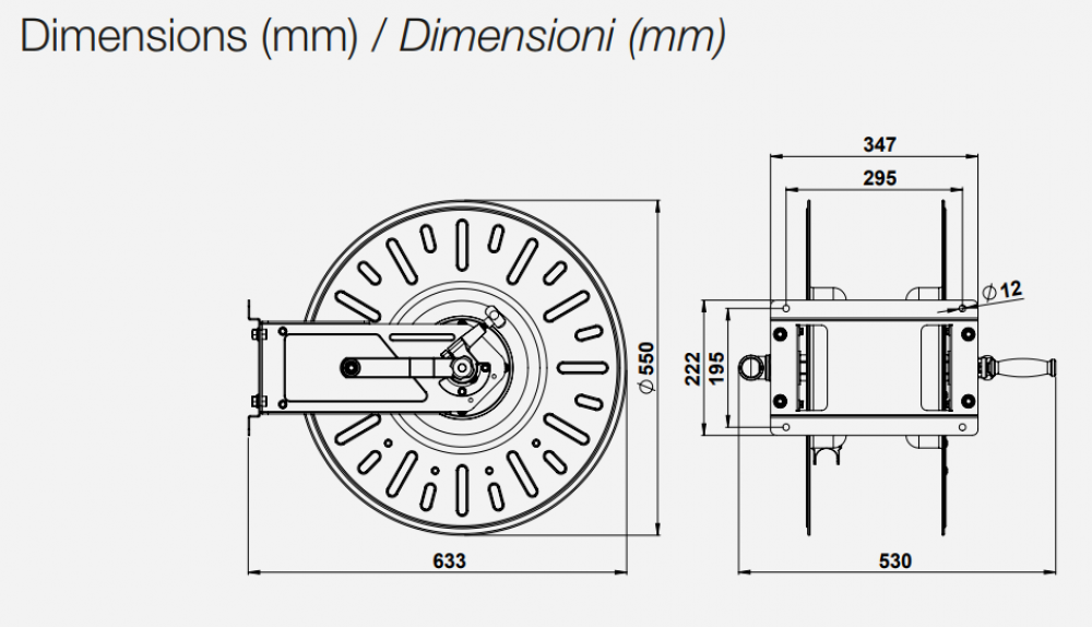 Hose reel without hose. Capacity: 1/2"-5/8" - Inlet G 1/2" M - Outlet G 1/2" M