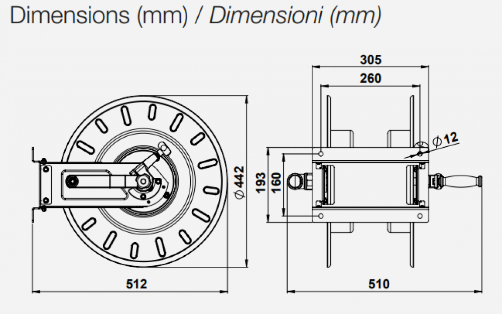 Hose reel without hose. Capacity: 1/4"-5/16"-3/8" - Inlet G 3/8" F - Outlet G 3/8" M