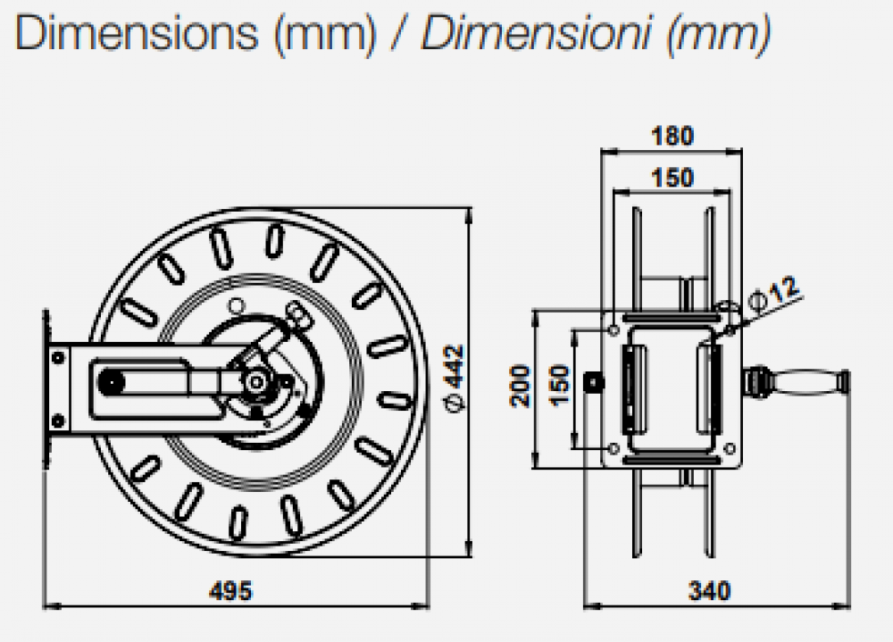 Hose reel without hose. Capacity: 1/4"-5/16"-3/8" - Inlet G 3/8" F - Outlet G 3/8" M