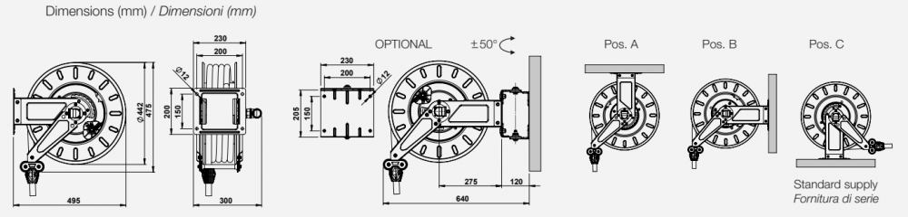 Hose reel without hose. Capacity: 10 m 35 mm OD hose - In. 1" F - Out. o 25 mm hose tail - stainless steel shaft and swivel