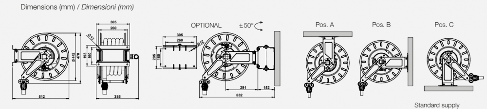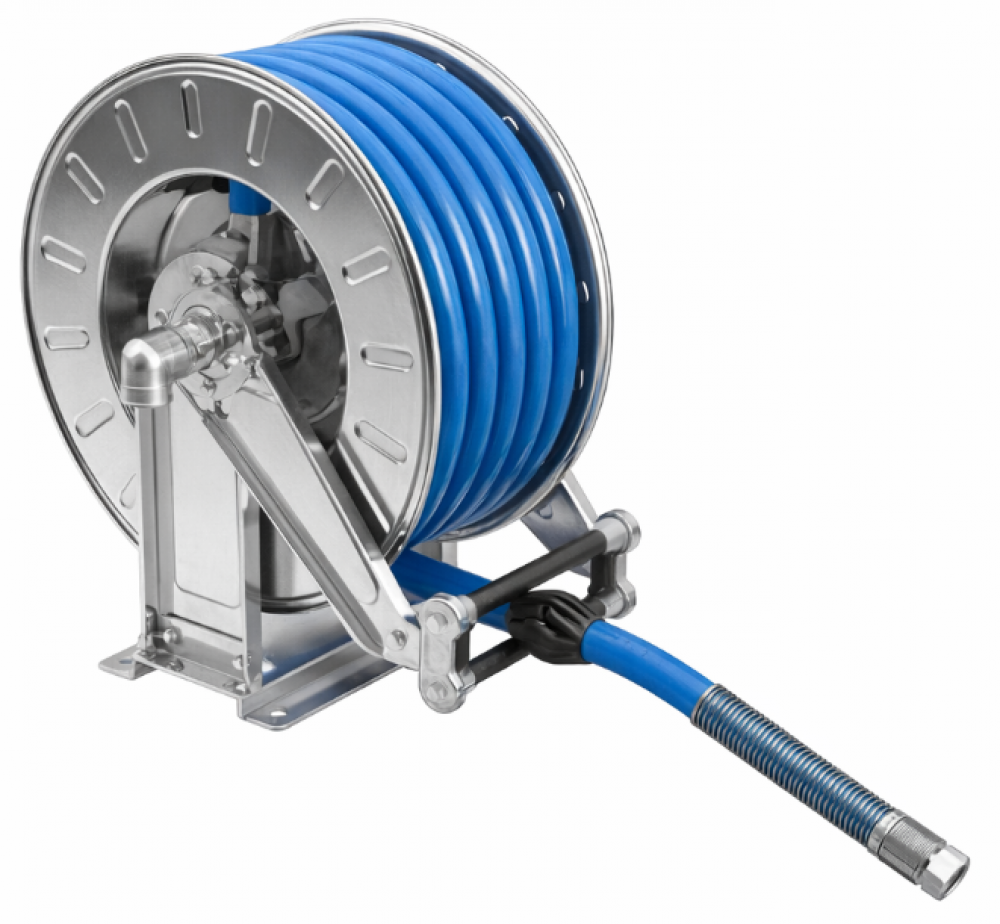 Hose reel without hose. Capacity: 15 m 35 mm OD hose - In. 1" F - Out. o 25 mm - stainless steel shaft and swivel