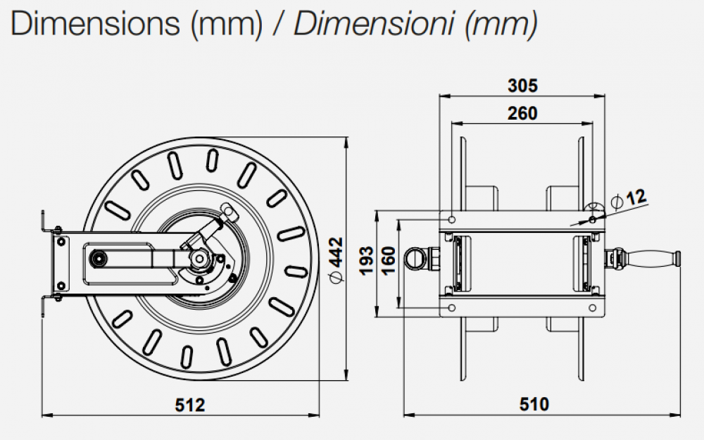 Hose reel without hose. Capacity: 3/4"-1" - Inlet G 1" M - Outlet G 1" M