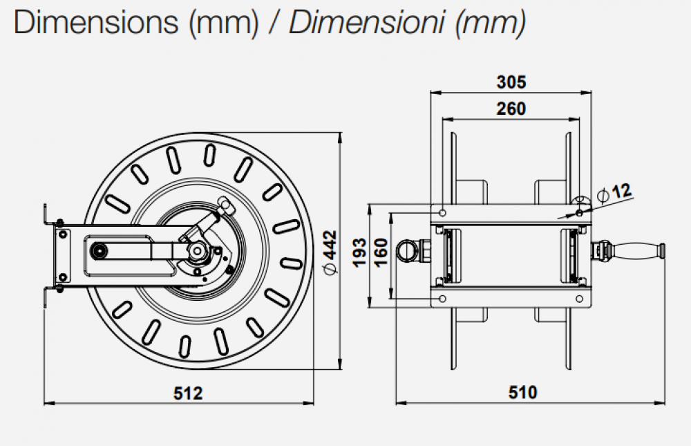 Hose reel without hose. Capacity: 3/4" - Inlet G 1" F - Outlet o19 mm