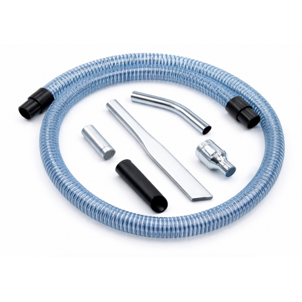 ZESTAW AKCESORIÓW śr.40 (OLEJ I WIÓRY): mufa PU ant, mufa 50/40, wąż PU 3 m, zgięte przyłącze stalowe, redukacja 80/50, lanca aluminiowa 500 mm, przyłącze proste, gumowa dysza stożkowa.