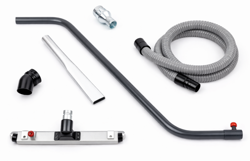 ZESTAW AKCESORIÓW śr.50 WD: 2 mufy PVC, wąż PVC 3 m, 1 redukcja 80/50, 1 szczotka PVC, 1 podwójnie gięta, 1 dysza płaska 500 mm, 1 wycieraczka na kółkach.