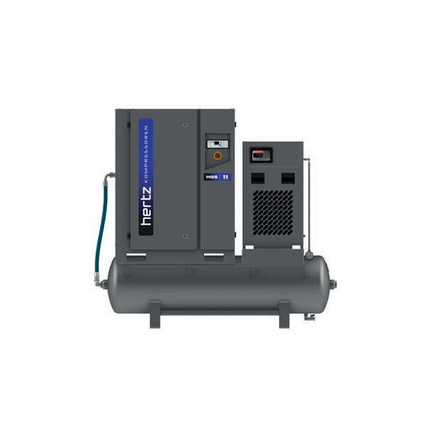 Sprężarka śrubowa Hertz HGS 15+Z+O, stałoobrotowa, napęd pasowy, moc: 15 kW, ciśnienie: 7,5 / 8,5 / 10 / 13 bar; zbiornik 250 l + osuszacz HRD 50