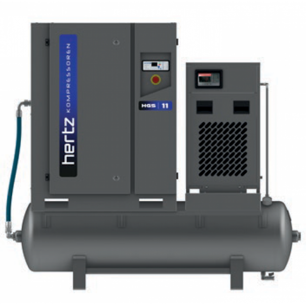Sprężarka śrubowa Hertz HSC 22+Z+O, stałoobrotowa, napęd pasowy, moc: 22 kW, ciśnienie: 7,5 / 8,5 / 10 / 13 bar; zbiornik 2x270 l + osuszacz HRD 70