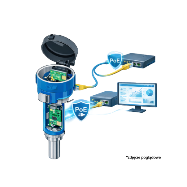 Interfejs Ethernet PoE Z695 5007 umożliwia bezpośrednie podłączenie przepływomierzy VA500, VA520 oraz FA500 do sieci Ethernet. Dzięki obsłudze technologii Power over Ethernet (PoE) urządzenie może być jednocześnie zasilane i komunikować się przez jeden przewód sieciowy, co znacząco upraszcza instalację.